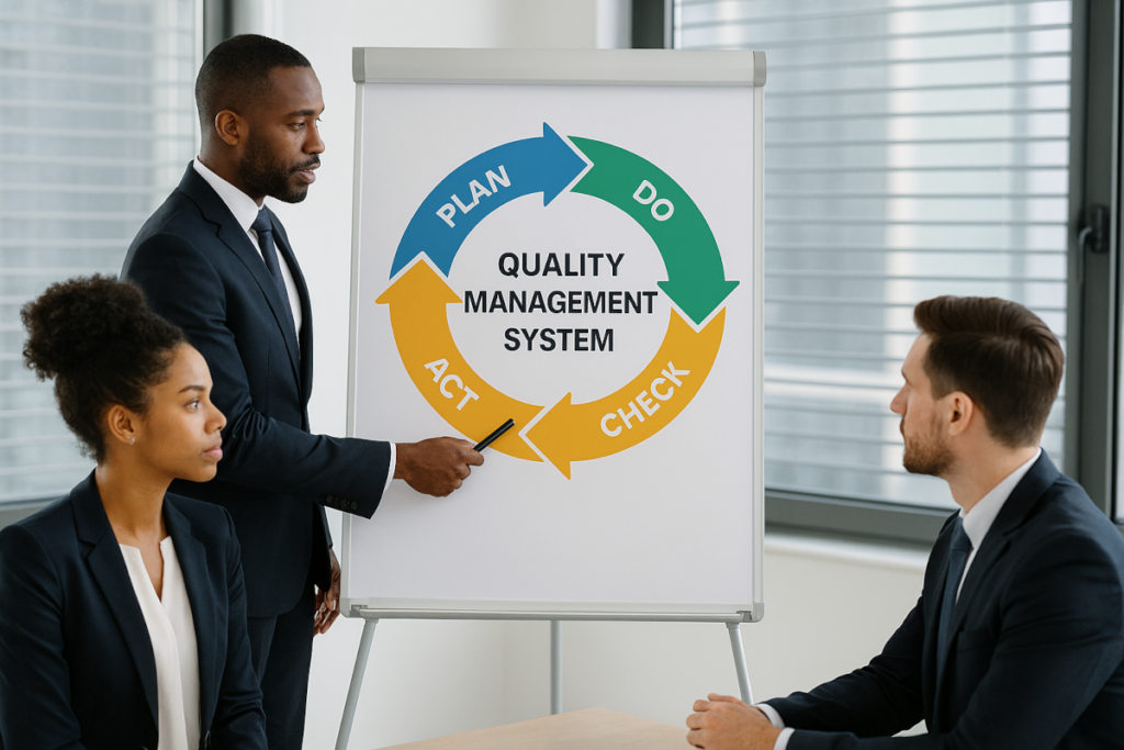 Conjunto organizado de políticas, procesos, procedimientos y responsabilidades que una organización implementa para asegurar que sus productos o servicios
